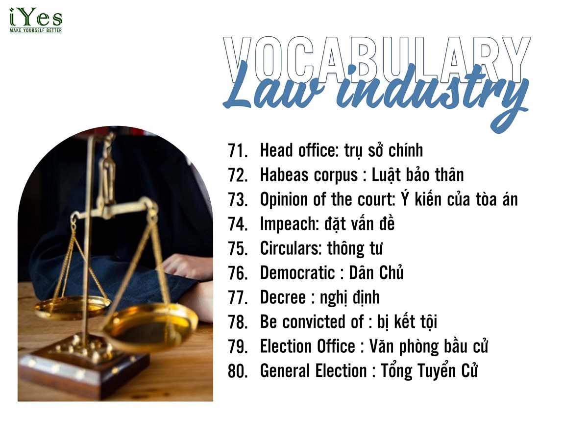 Ngày nay, tiếng Anh là ngôn ngữ phổ biến và quan trọng trong cuộc sống, nhưng với mỗi nhu cầu học khác nhau bạn sẽ có một cách học riêng biệt. Cụ thể, đối với người làm trong lĩnh vực Luật, họ sẽ cần vốn từ vựng tiếng Anh chuyên ngành Luật nhất định để phục vụ yêu cầu công việc. Cùng iYes ôn tập một số kiến thức liên quan đến từ vựng chuyên ngành Luật trong chuyên mục kỳ này nhé!